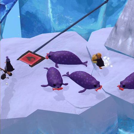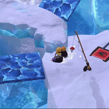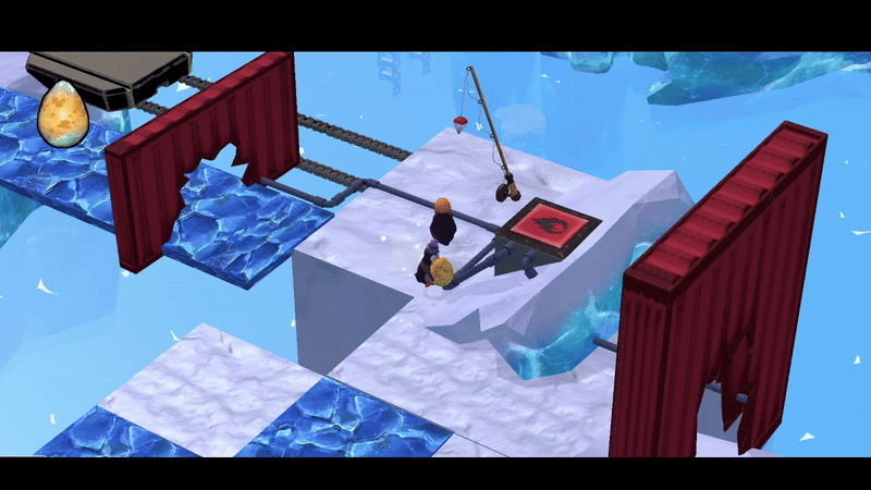 Players lure the seal onto a button using a fish from a pile. The seal's weight activates a platform to send the Egg-bearer to the next part. There, the Egg-bearer activates a button so the Eggless penguin can slide on falling platforms to join the other player and the egg.