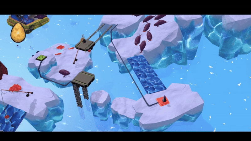 Next, with no fish nearby, players use the Egg as bait to lure seals to their doom. By using falling platforms, players can drop the seals out of the way.